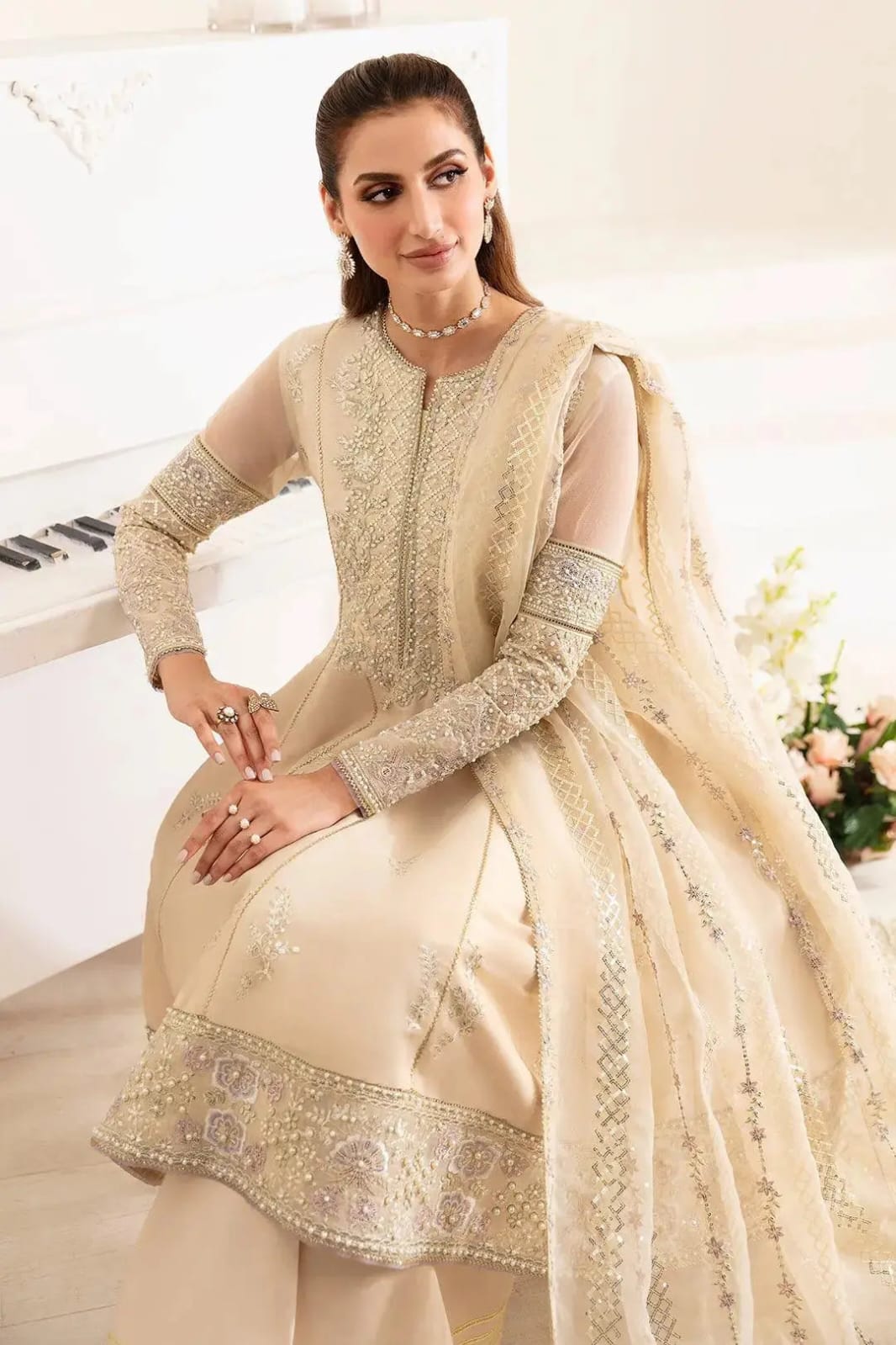 Embroidered Pearl Embellished Front & Back Daman Border Organza