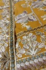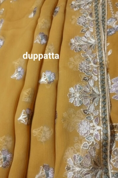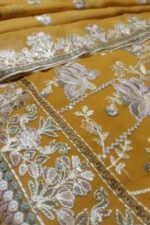 Elegant 3-piece mustard chiffon embroidered suit by Ayaan Fashion Studio.