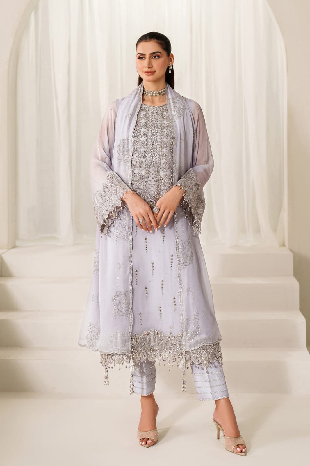 Stitched includes Shirt, Lining, Dupatta and Trouser all embellished as shown in pictures.