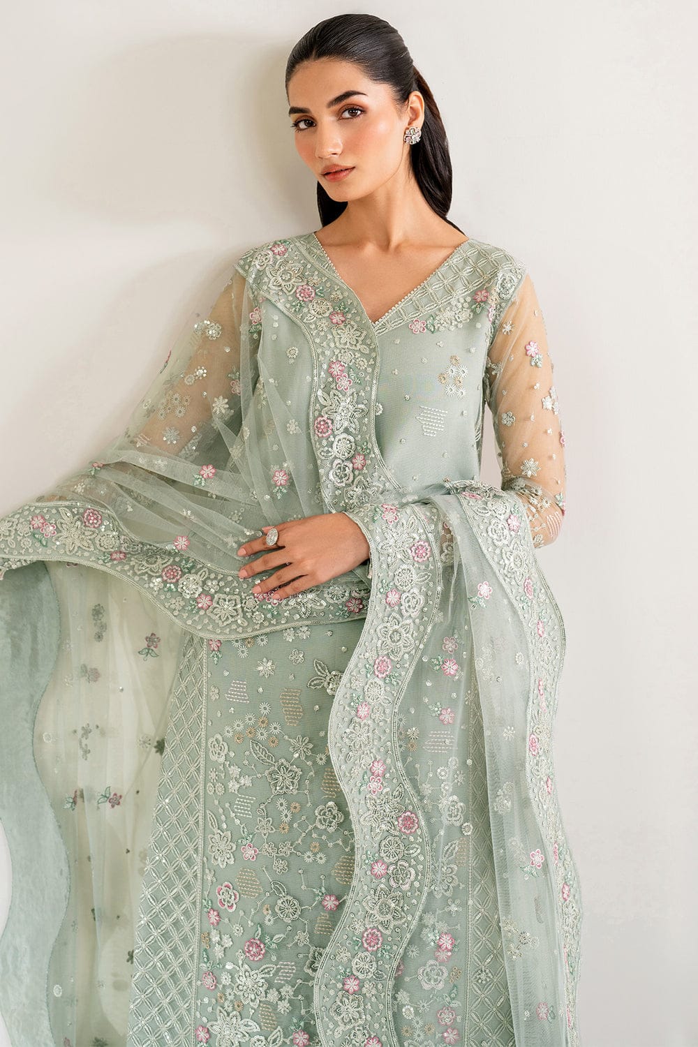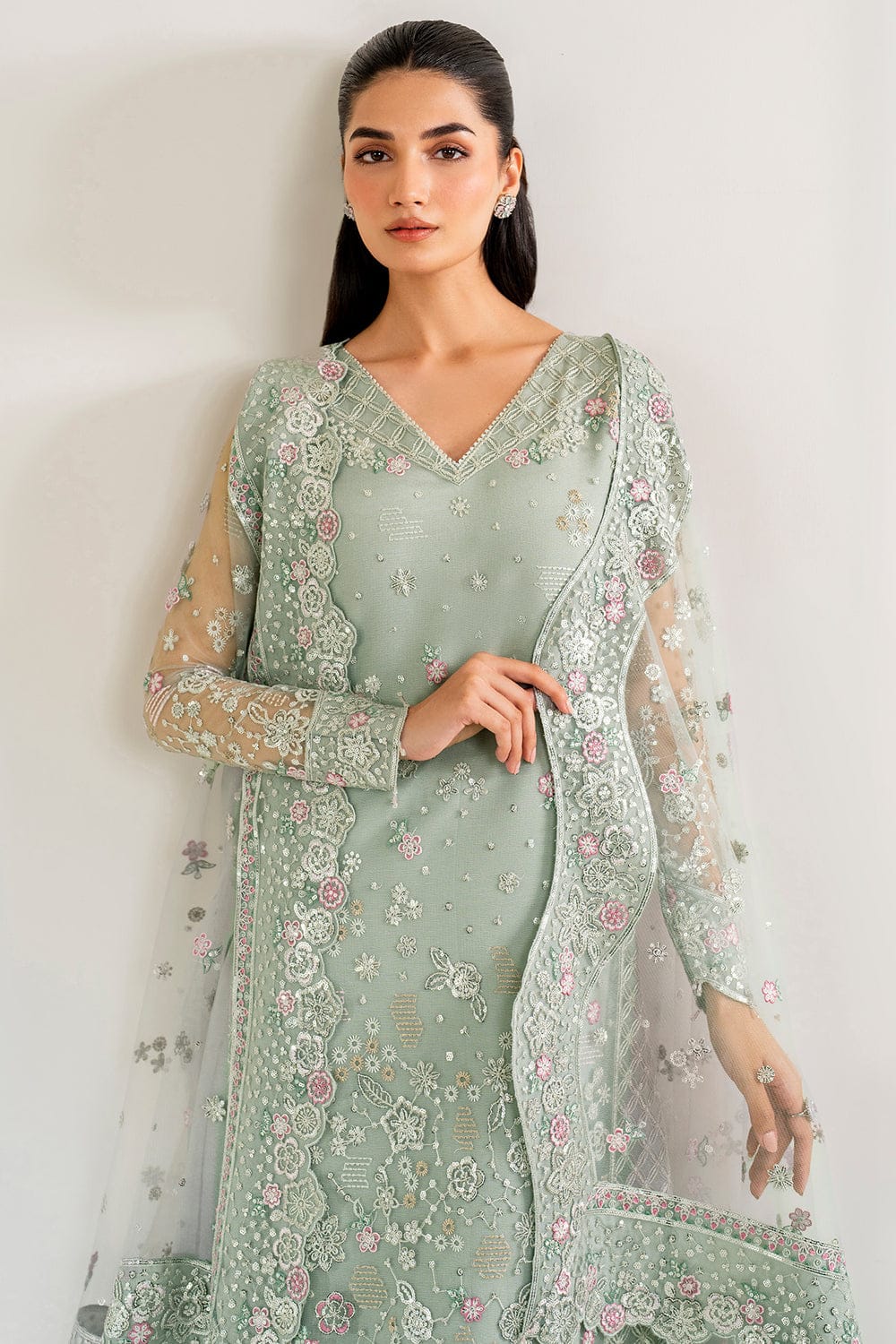 Stitched includes Shirt, Lining, Dupatta and Trouser all embellished as shown in pictures.